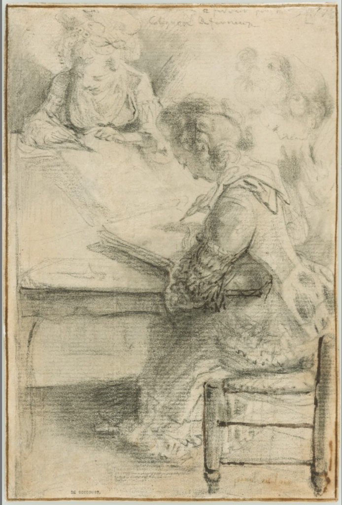 The black stamp at lower left “De Goncourt” confirms the provenance of the sheet in the collection of Edmond and Jules de Goncourt, who rehabilitated Saint-Aubin’s reputation in the late nineteenth century (in his own time, Saint-Aubin was not considered a “proper” artist since he did not make large history paintings or work within another established genre). In their writings the brothers identify the Getty sheet as depicting three young women drawing, and we retain that title, although the profile at right is very possibly a subsidiary sketch of the principal figure, with similar curls and costume. And what are they drawing? It’s almost impossible to make out, but I sometimes think I see the face of a figure on the sheet of the young women farthest from us. Are they sketching each other?